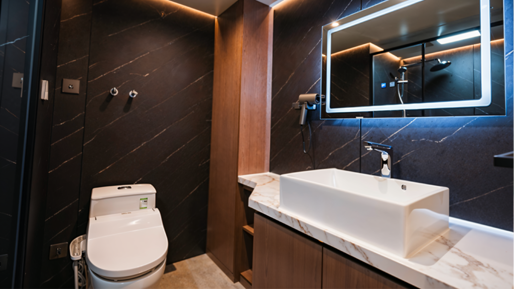 Située près de l’entrée du Dreamcube Famille, la salle de bain est équipée d’une douche spacieuse et moderne, offrant une expérience de douche relaxante. L’aménagement optimisé inclut des équipements haut de gamme tels que des toilettes intelligentes, un lavabo design, ainsi que des étagères murales pour un rangement efficace sans sacrifier l’esthétique de la pièce.