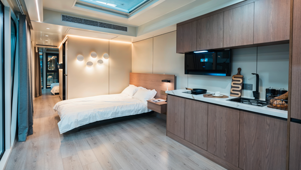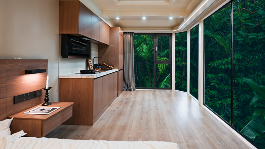 Des armoires murales offrent des options de rangement pratiques pour vos effets personnels, et un coin kitchenette en option permet de préparer des repas simples sans occuper trop d’espace. Cet espace est baigné de lumière naturelle grâce aux baies vitrées, créant un environnement chaleureux et accueillant.