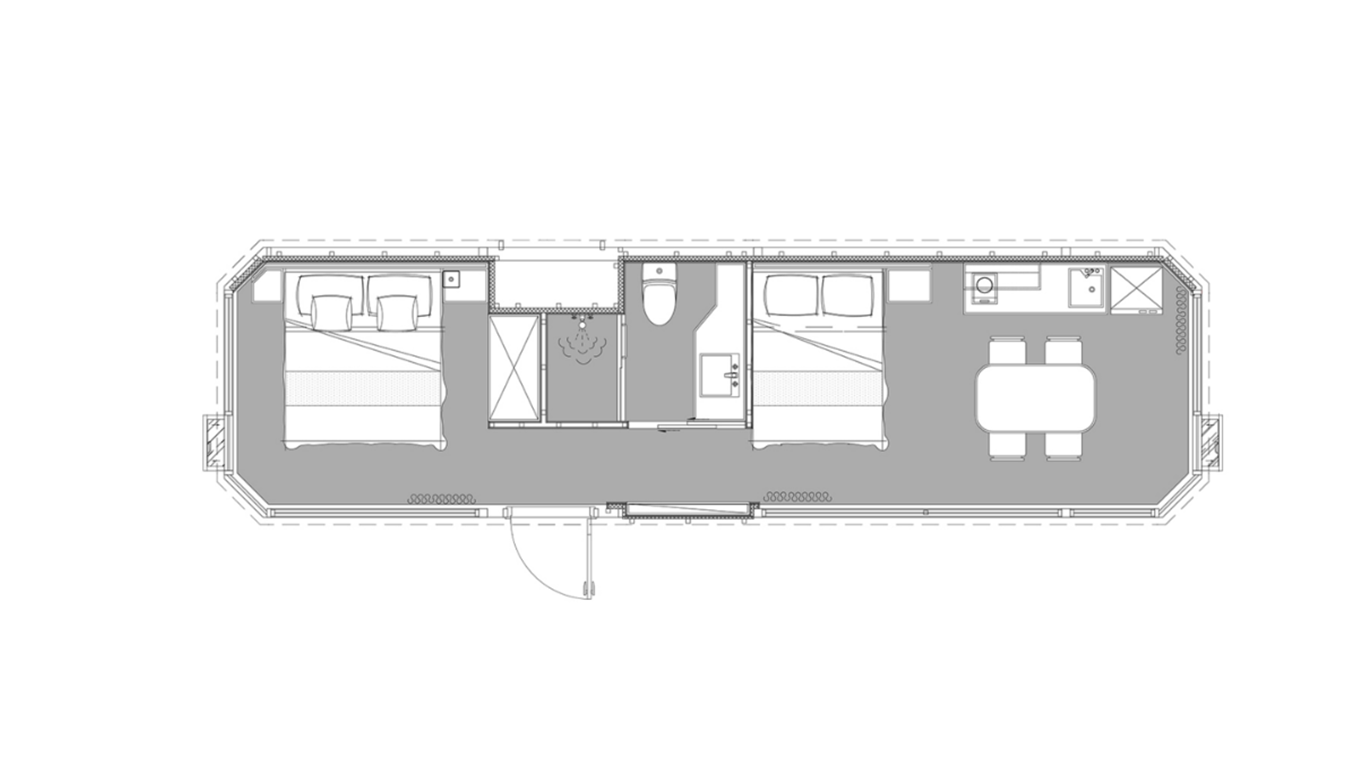 L’espace de vie du Dreamcube Famille est conçu pour s’adapter à vos besoins quotidiens. Il inclut une table pliante qui peut servir à la fois de bureau ou de table à manger, selon vos préférences. Grâce à son agencement modulaire, cet espace est facilement personnalisable, permettant une transformation rapide pour accueillir davantage de fonctions (espace de travail, coin détente, etc.).