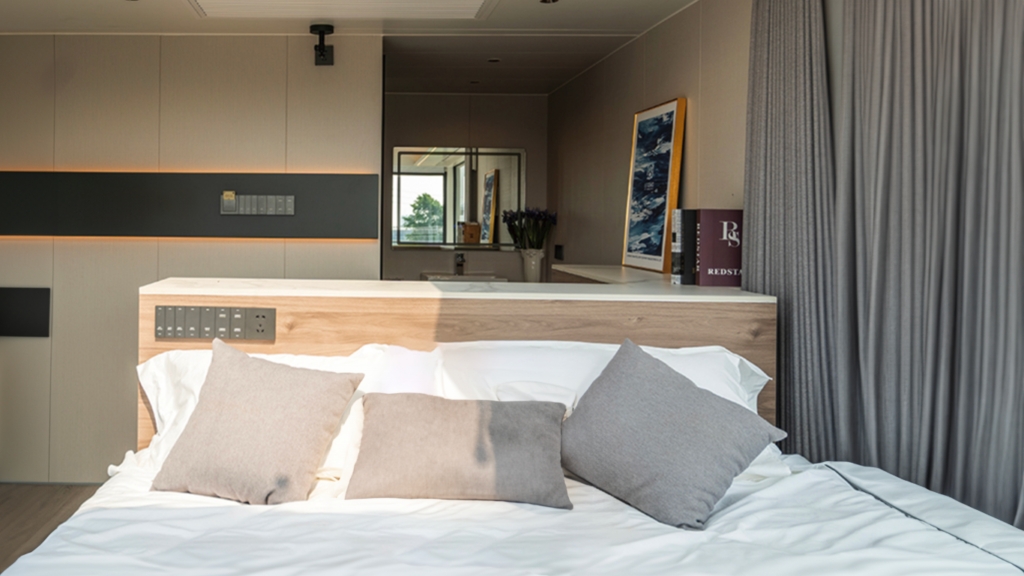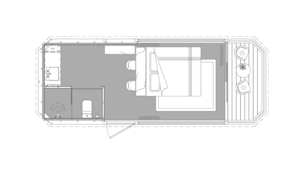 Située à l’extrémité du DreamCube Suite, la chambre offre un lit double spacieux, idéal pour deux personnes. Cet espace optimisé inclut des solutions de rangement intégrées sous le lit pour maximiser l’espace disponible. Des étagères murales supplémentaires permettent de ranger vos affaires sans encombrer la pièce, assurant ainsi une chambre à la fois fonctionnelle et élégante.