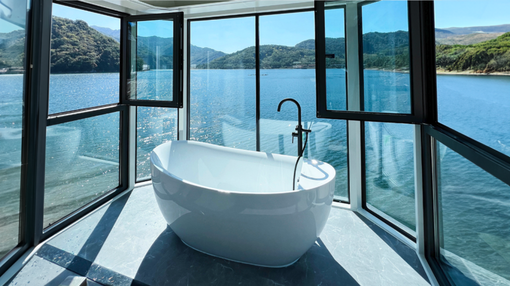 Située près de l’entrée du DreamCube Suite, la salle de bain est équipée d’une douche spacieuse et moderne, offrant une expérience de douche relaxante. L’aménagement optimisé inclut des équipements haut de gamme tels que des toilettes intelligentes, un lavabo design, ainsi que des étagères murales pour un rangement efficace sans sacrifier l’esthétique de la pièce.